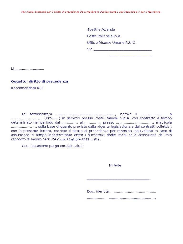 Lettera diritto di precedenza poste italiane